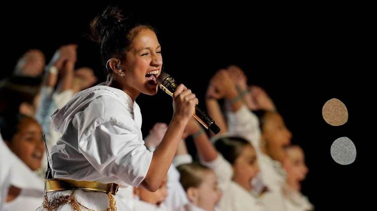 La energía de los espectadores se hace sentir con el éxito de JLO del 2010 “Get On The Floor”. Súbitamente, bajan las luces y solo se escucha una voz femenina acapella, que resulta ser, nada más y nada menos que: ¡la hija de Jennifer López, Emme Anthony!